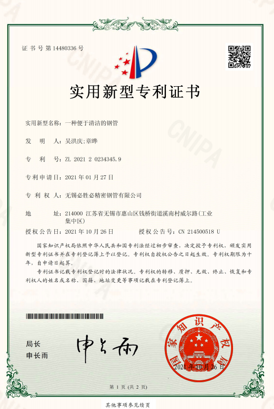 一种便于清洁的钢管_2021202343459_实用新型专利证书_2021-10-26